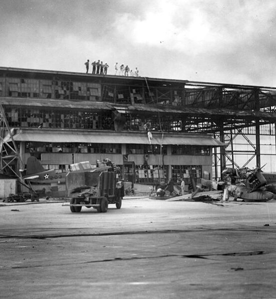 U.S. Navy personnel inspect a damaged hangar at Naval Air Station Ford Island in the aftermath of the Japanese attack on Pearl Harbor, Hawaii (USA), December 1941. A destroyed Vought OS2U Kingfisher is visible on the right, another OS2U of Observation Squadron VO-2 is worked on., U.S. Navy, U.S. Navy National Museum of Naval Aviation photo No. 1996.488.029.080, PD-USGov