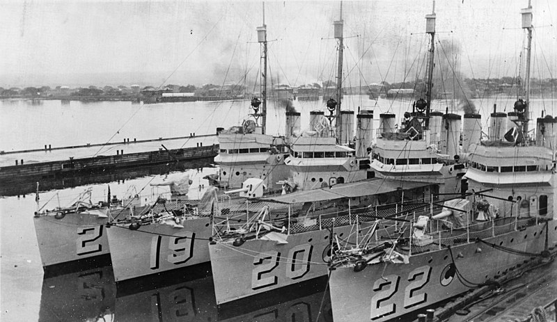 The U.S. Navy destroyer minelayers USS Sicard (DM-21), USS Tracy (DM-19), USS Preble (DM-20) and USS Pruitt (DM-22) at anchor in the Hawaiian Islands, 30 July 1939., U.S. Navy, Official U.S. Navy photo NH 81004 from the U.S. Navy Naval History and Heritage Command, PD-USGov