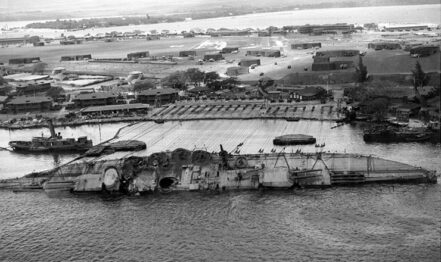 Ship righted to about 30 degrees, on 29 March 1943, while she was under salvage at Pearl Harbor. She had capsized and sunk after receiving massive torpedo damage during the 7 December 1941 Japanese air raid. Ford Island is at right and the Pearl Harbor Navy Yard is in the left distance., U.S. Navy Photograph, http://www.history.navy.mil/photos/events/wwii-pac/pearlhbr/ph-ok9.htm, PD-USGov