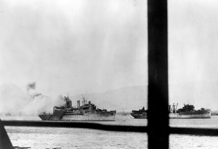 The U.S. Navy seaplane tender USS Curtiss (AV-4) afire on 7 December 1941 at Pearl Harbor, Hawaii (USA), after she was hit by a crashing Japanese Aichi D3A1 ("Val") dive bomber. The rails in the picture belong to USS Tangier (AV-8) from where the photo was taken. The repair ship USS Medusa (AR-1) is at right and is partially obscured by the rails. The timbers floating in the water in the foreground may be from USS Utah (AG-16), which had been sunk at her berth, astern of Tangier. Note the weathered paintwork on Curtiss and Medusa and that Curtiss is already equipped with an CXAM air search radar., Unknown author, Naval History & Heritage Command Accession number NH 96660, PD-USGov