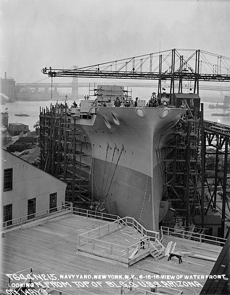 USS Arizona (BB 39), seen from the top of the New York Navy Yard's Building 6 on 15 June 1915. What is probably a christening platform is under construction. 181-6038121, Unknown author, US Naval History and Heritage Command, PD-USGov