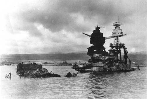 Aerial view of “Battleship Row” moorings at Pearl Harbor on the southern side of Ford Island, 10 December 1941, showing damage from the Japanese raid three days earlier. In upper left is the sunken USS California (BB-44), with smaller vessels clustered around her. Diagonally, from left center to lower right are: USS Maryland (BB-46), lightly damaged, with the capsized USS Oklahoma (BB-37) outboard. A barge is alongside Oklahoma, supporting rescue efforts. USS Tennessee (BB-43), lightly damaged, with the sunken USS West Virginia (BB-48) outboard. Battleship USS Arizona (BB-39), sunk, with her hull shattered by the explosion of the magazines below the two forward turrets. Note dark oil streaks on the harbor surface, originating from the sunken battleships., USN, Official U.S. Navy photograph 80-G-387565, PD-USGov