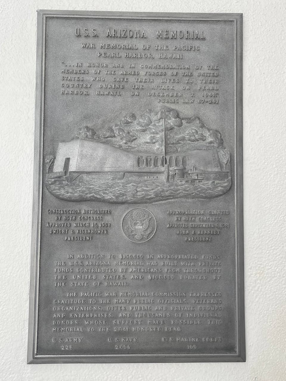 The dedication plaque for the Arizona Memorial Monument is on display in the assembly room of the USS Arizona Memorial. The plaque dedicates the Memorial to all US service members who died during the attack on Pearl Harbor.