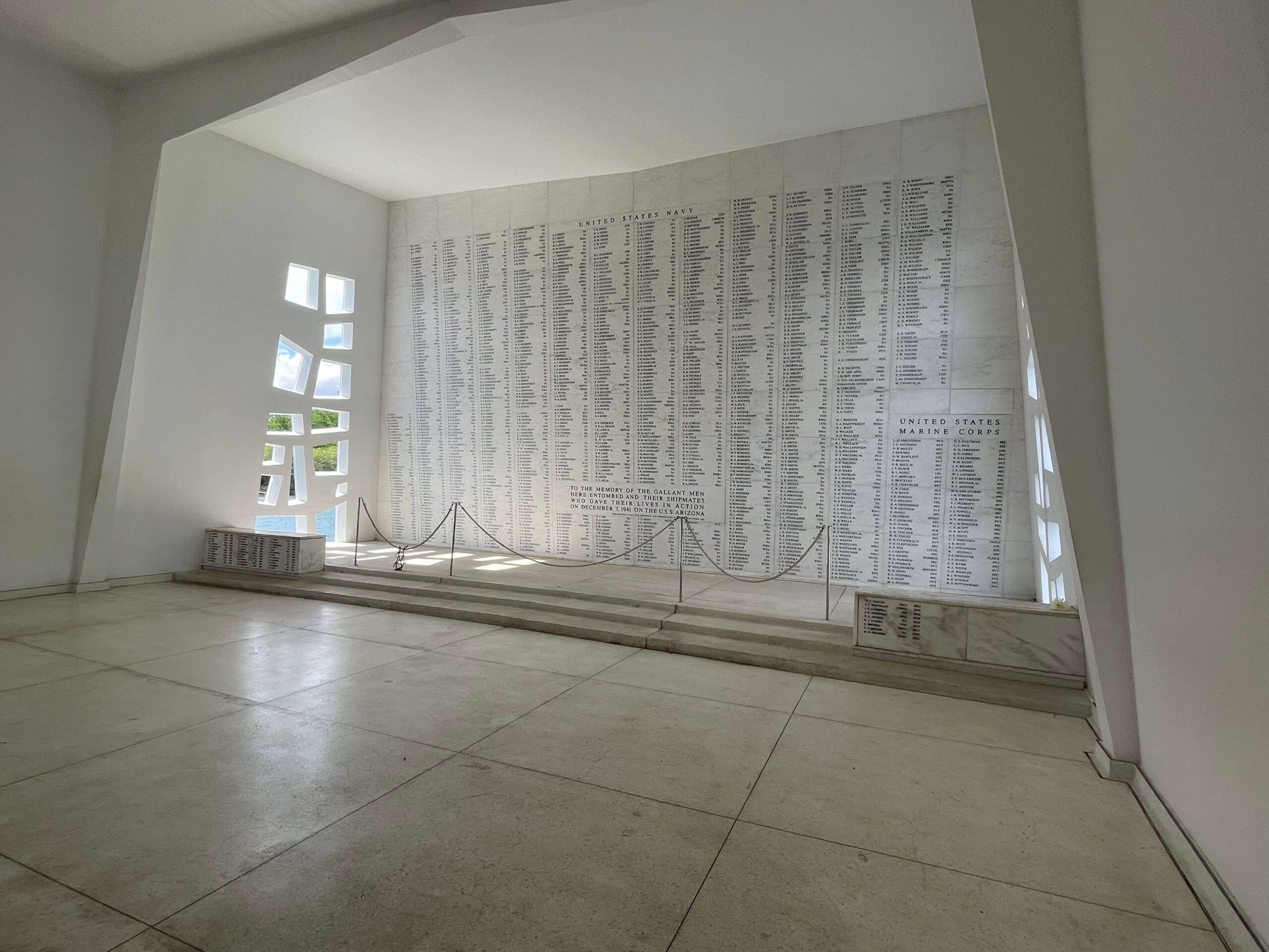 The shine room has the names of the 1032 fallen battleship USS Arizona servicemen carved in marble in alphabetical order. To the left of the shine, there is a plaque with 44 names of sailors that survived the bombing but later wanted to be interned with their shipmates within the Battleship. Throughout the years, the National Park Service has accommodated these intern requests and has conducted private ceremonies for their families aboard the Memorial. In a few instances, the survivor did not have any family to attend the services; in these cases, the National Park Services invited the Pearl Harbor Visitor Center employees to participate so he could receive a proper burial.