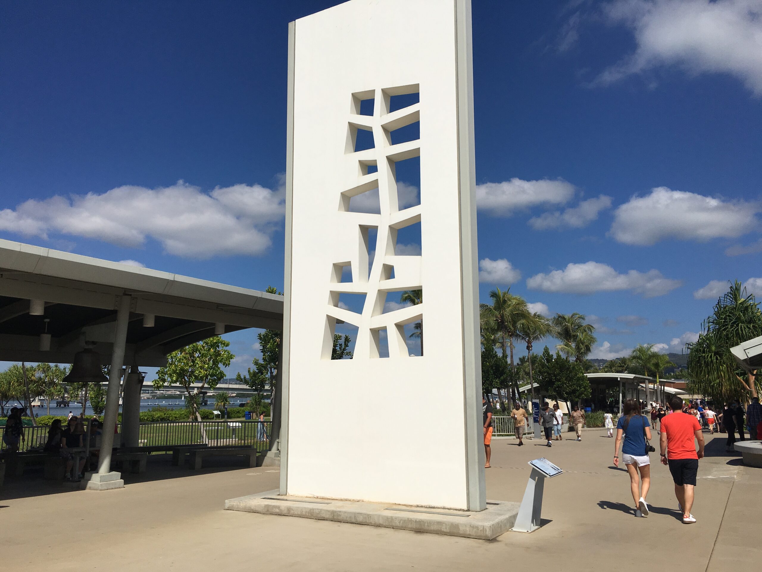 The memorial wall is flanked by the tree of life design on the Arizona Memorial Monument. The memorial wall bears the names of those who died aboard the USS Arizona battleship during the attack on Pearl Harbor.