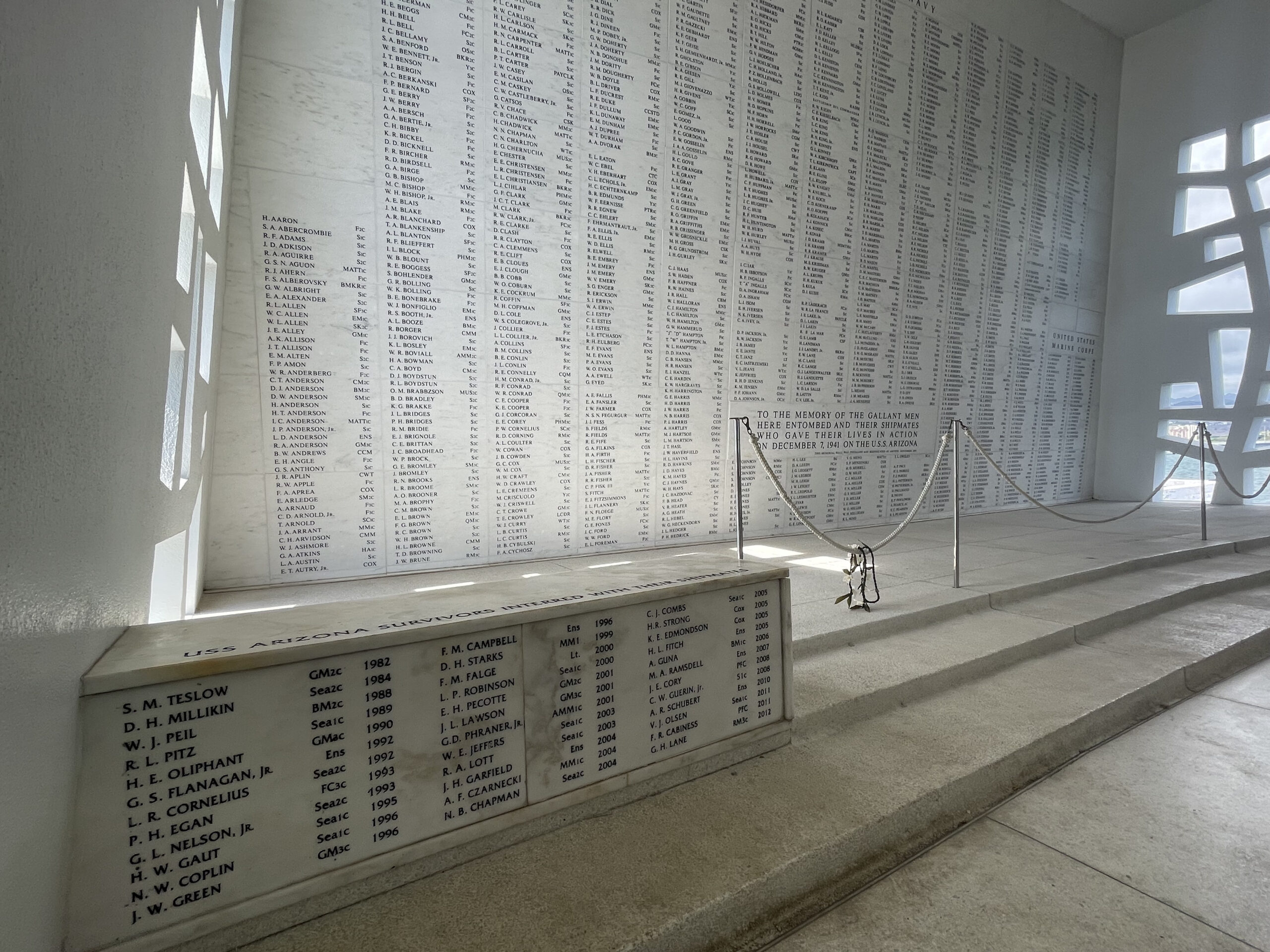 The shine room has the names of the 1,032 fallen battleship USS Arizona servicemen carved in marble in alphabetical order. Please note that on the shrine wall, there are: