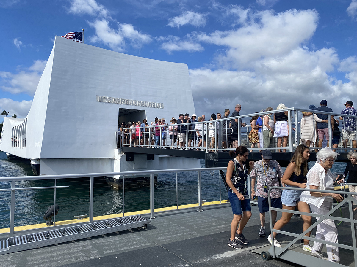 Visitors entering the exiting the Arizona Memorial Monument at Pearl Harbor. The US Navy operated shuttle boats ferry visitors between the Arizona Memorial Monument and the Pearl Harbor Visitor Center.