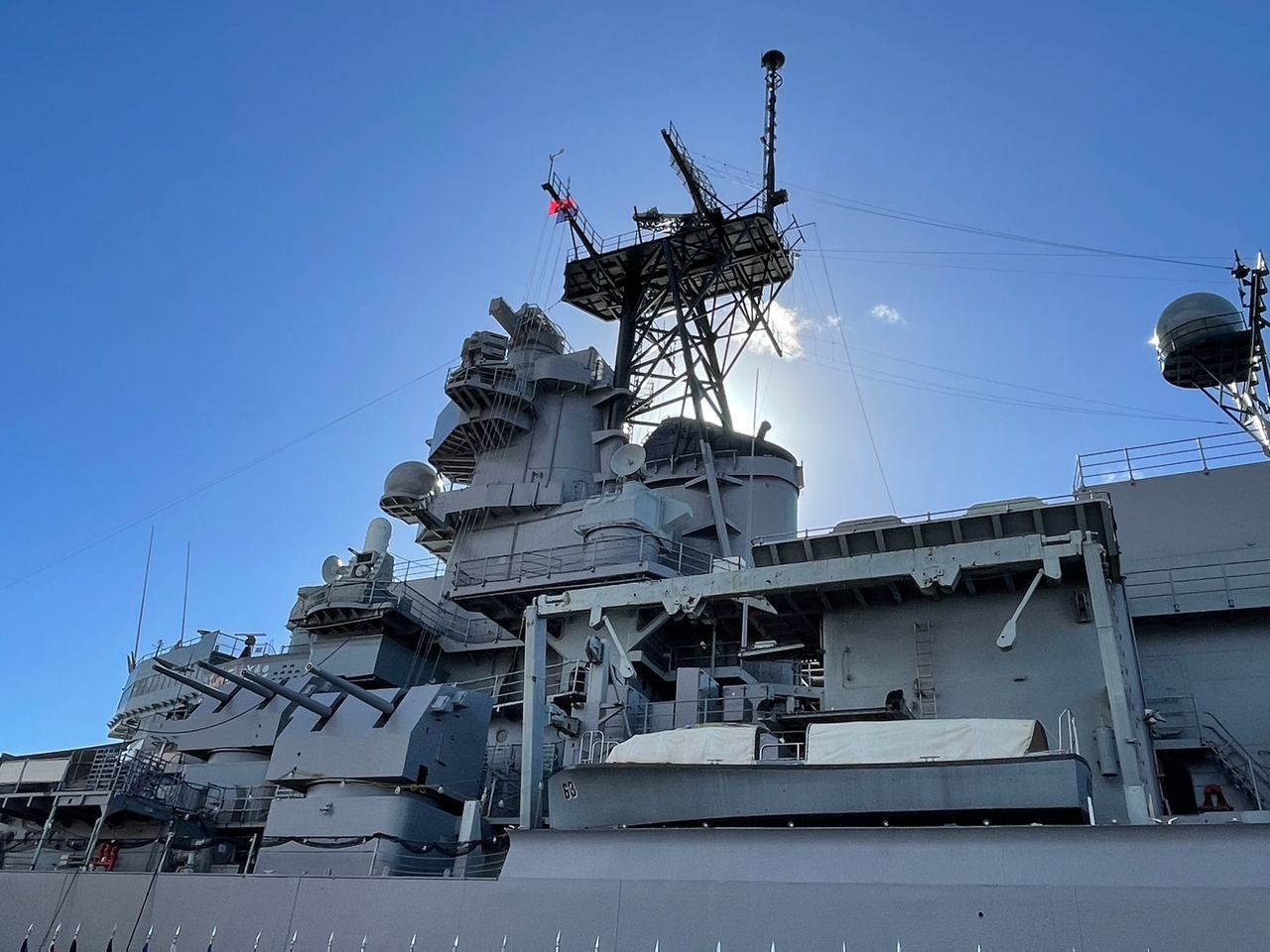 A port-side view of the USS Missouri battleship showing the citadel and foremast. One of the ship’s boats, secondary 5″-gun turrets, and a 20mm Close-in Weapon System (CIWS) mount are visible.
