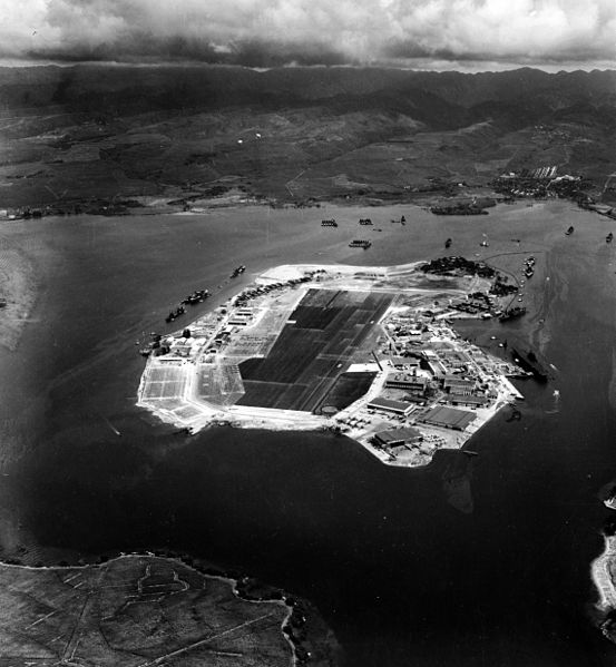 Aerial photograph of Ford Island, looking about NNE, taken 10 October 1941. The Naval Air Station occupies most of the Island, with the seaplane base on the point at the near right. There are about twenty PBY patrol planes parked there. USS Enterprise (CV-6), USS Curtiss (AV-4) and two battleships are tied up along Ford Island's southeastern side, to the right. Aiea is on the far shore in the upper right., Official U.S. Navy Photograph, now in the collections of the National Archives., Official U.S. Navy photo 80-G-279375 from the U.S. Navy Naval History and Heritage Command, PD-USGov.