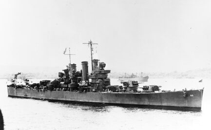 The U.S. Navy light cruiser USS Helena (CL-50) at a South Pacific base, between battles, circa in 1943. This image has been retouched to remove radar antennas from the gun directors and masts., Unknown author, Naval History & Heritage Command Accession number NH 95814, PD-USGov