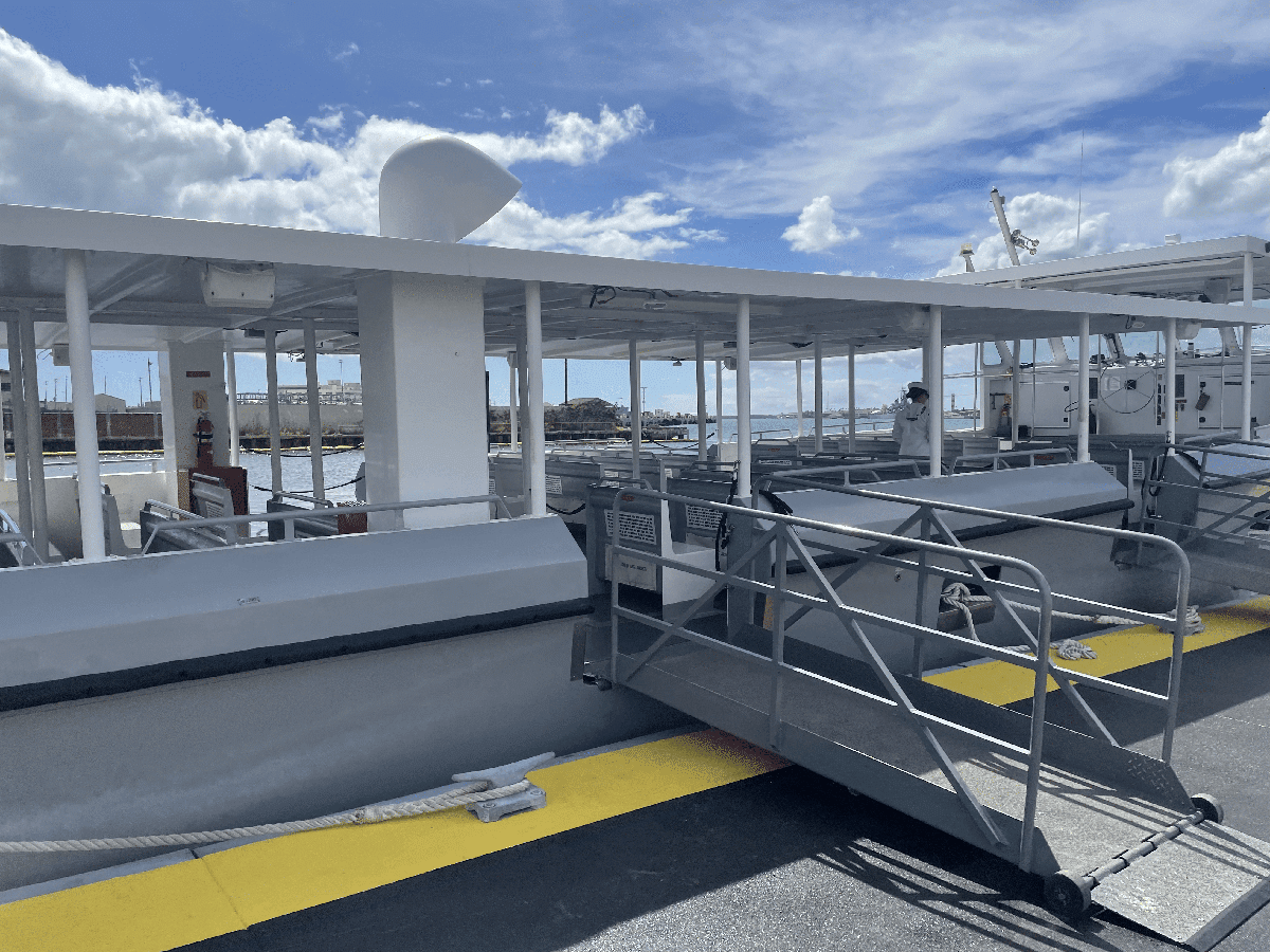 The US Navy shuttle can accommodate 150 passengers for the trip to the Arizona Memorial monument.