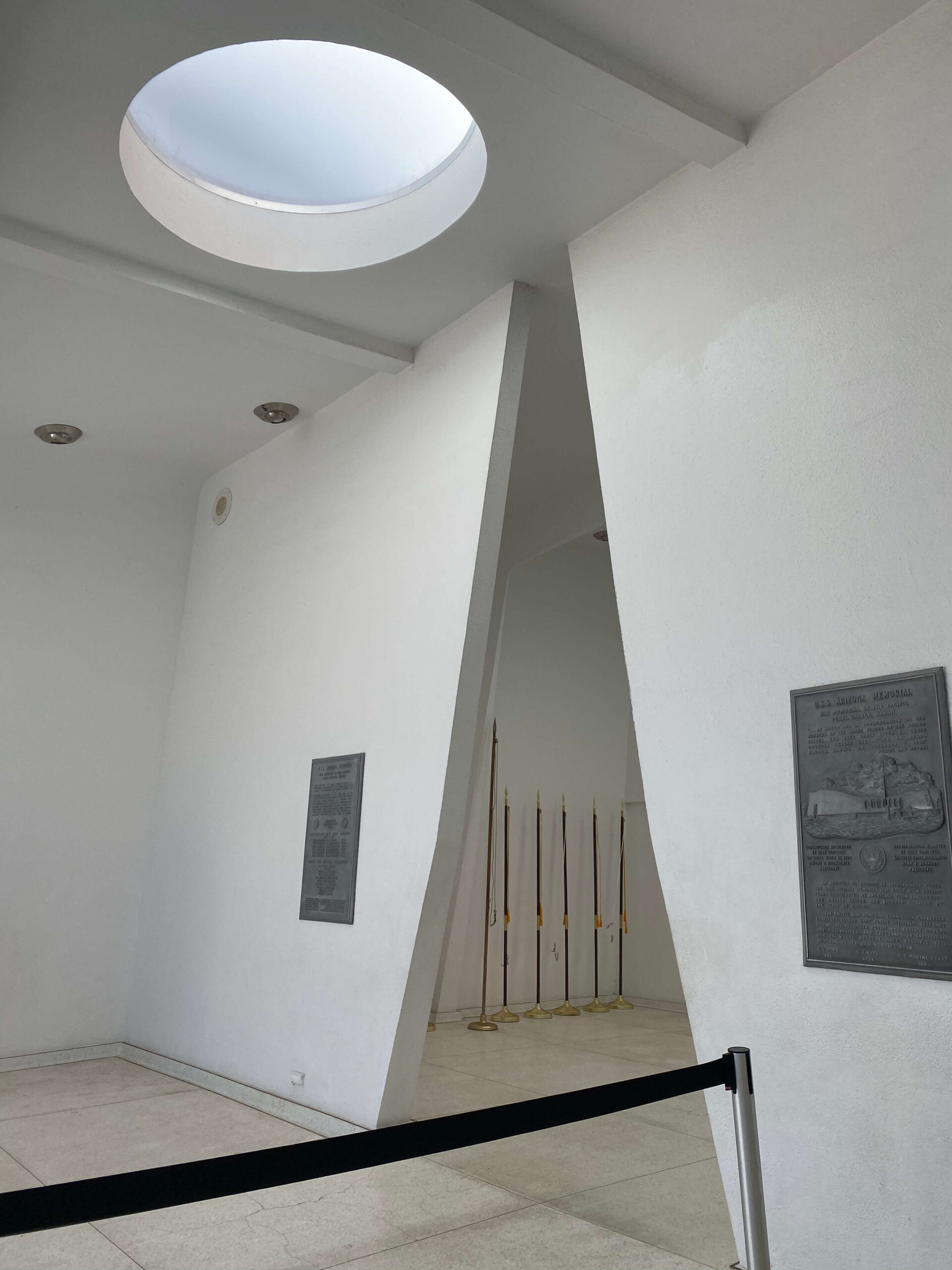 A view of the flag room as seen from the entrance to the Arizona Memorial Monument. The USS Arizona Memorial enjoys a very open design to let in a lot of natural light.